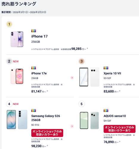 でもドコモオンラインショップでは売れ筋ランキング3位には入ってるから